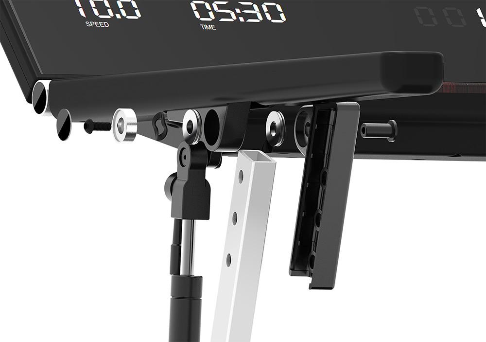 La stabilité du bâti d’un tapis de course pliable dépend du processus de fabrication, des matériaux utilisés ainsi que du serrement et de la fermeté des composants, la connexion entre les composants et les paliers lisses. RH Fitness adopte un ensemble de paliers lisses au niveau du joint de la colonne verticale pour que le cadre et les autres composants du tapis de course présentent une grande capacité portance et une excellente rigidité dans des espaces très restreints. Cette conception résout les problèmes de la déflection latérale et assure la stabilité de l’ensemble.